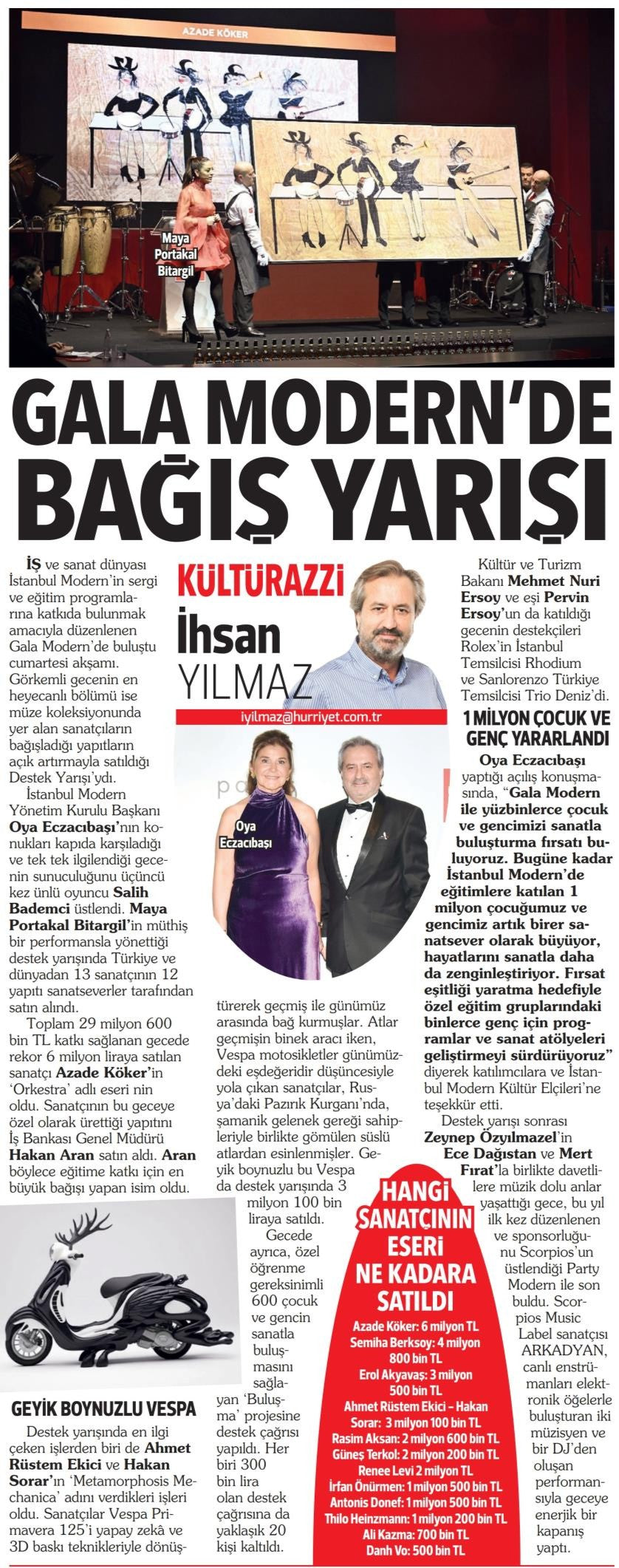 İş ve sanat dünyası İstanbul Modern'in sergi ve eğitim programlarına katkıda bulunmak amacıyla düzenlenen Gala Modern'de buluştu. Görkemli gecenin en heyecanlı bölümü ise müze koleksiyonunda yer alan sanatçıların bağışladığı yapıtların açık artırmayla satıldığı Destek Yarışı'ydı.