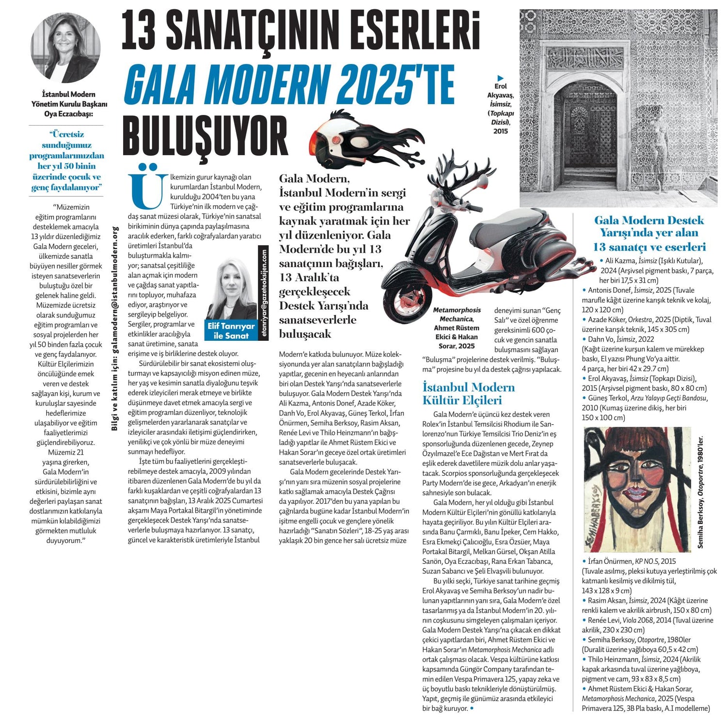 Gala Modern, İstanbul Modern'in sergi ve eğitim programlarına kaynak yaratmak için her yıl düzenleniyor. Gala Modern'de bu yıl 13 sanatçının bağışları, 13 Aralık'ta gerçekleşecek Destek Yarışı'nda sanatseverlerle buluşacak.