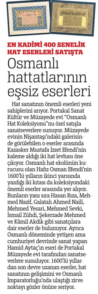Hat sanatının önemli eserleri yeni sahiplerini arıyor. Portakal Sanat Kültür ve Müzayede Evi "Osmanlı Hat Koleksiyonu"nu özel satışla sanatseverlere sunuyor.