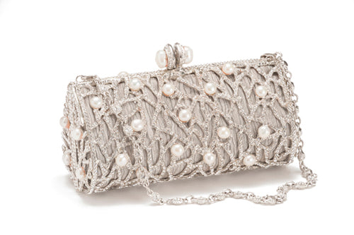 Gümüş rengi kristal taşlı ve incili gece çantası.