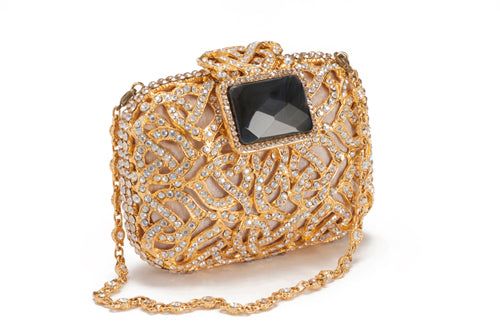 Altın rengi kristal taşlı ve tokası yarı değerli taşlı zincir askılı gece çantası