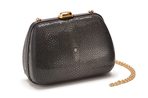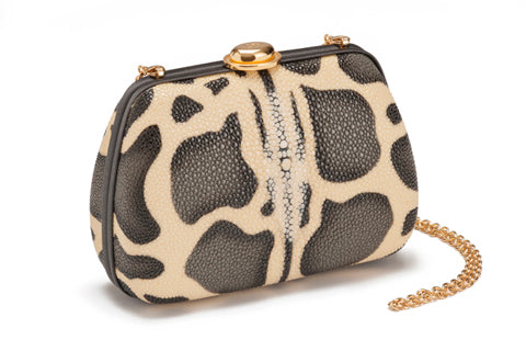 Galuchat vatoz siyah ve beyaz leopar desenli zincir askılı gece çantası