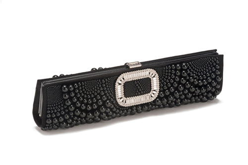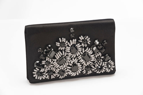 Siyah saten boncuklu orta kısmı kristal taşlı gece çantası
