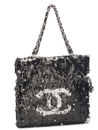 Siyah ve gümüş renkli sequin çift c inisyalli zincir askılı çanta