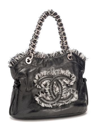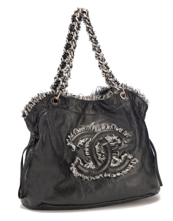 Siyah fur trim lambskin çift c inisyalli zincir-tüy askılı el çantası