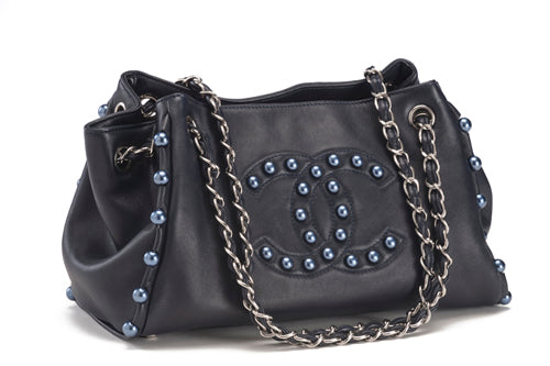 Lacivert lambskin çift c inisyalli lacivert inci kaplı zincir-deri askılı çanta