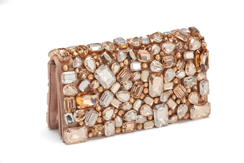 Saten altın rengi ve beyaz rasostone taşlı gece çantası