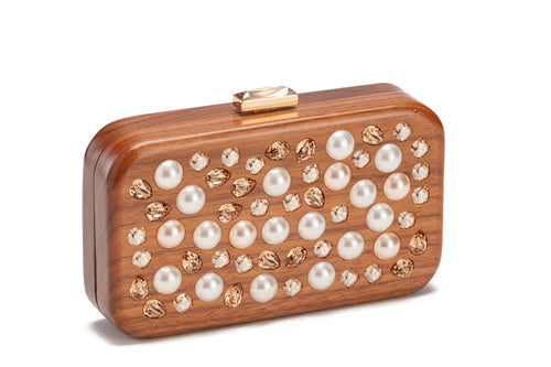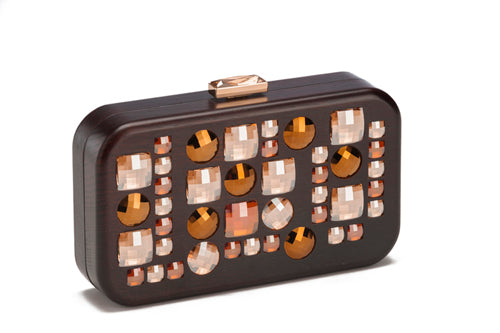 Koyu kahverengi tahta kristal taşlı gece çantası