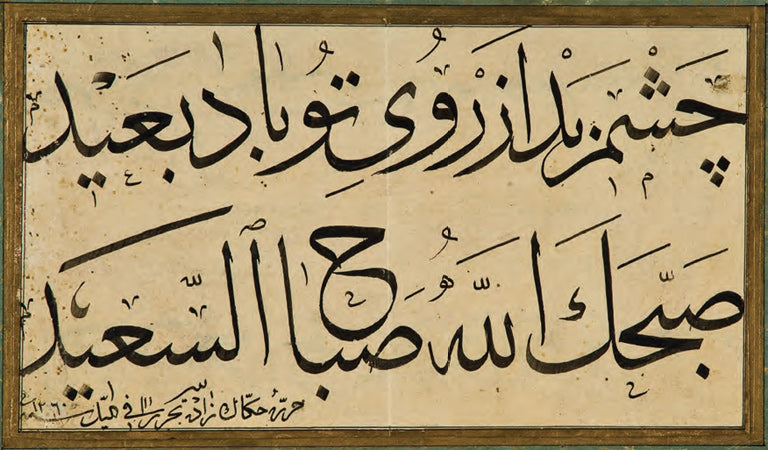 Ne zaman yurt dışında hat üzerine konferans versem mutlaka gelen sorulardan biri şudur: “Hep erkek hattatlardan söz ettiniz; hiç kadın hattat yok muydu?” Buna cevabım da hep şöyle olur: “Olmaz olur mu? Her şeyin başında Esma İbret Hanım vardır.” İşte bu güzel nesih kıt’a onun eseri, “ba tahmin on beş yaşında” olduğu 1209 (1794-95) yılında yazılmış. Üstelik Mahmud Celaleddin Efendi’nin öğrencisi olduğunu da belirtmiş ki o da hoş bir ayrıntı. Çünki daha sonra evlenmişler, İbnülemin’in renkli üslubuyla kaydettiği üzere “Mahmud hoca iken koca oldu.” I.C.S.