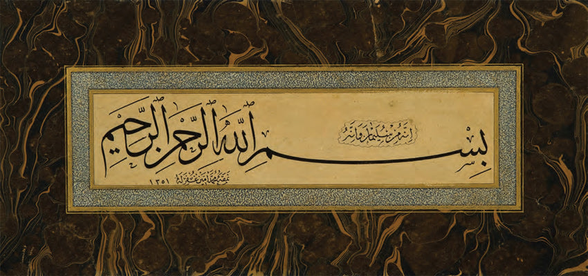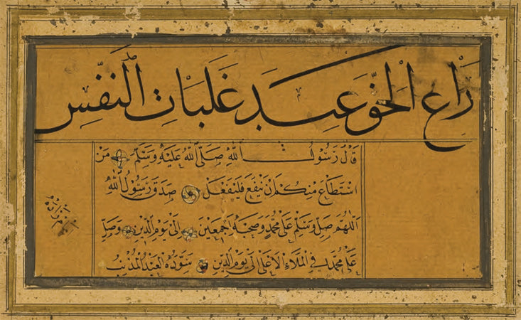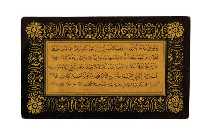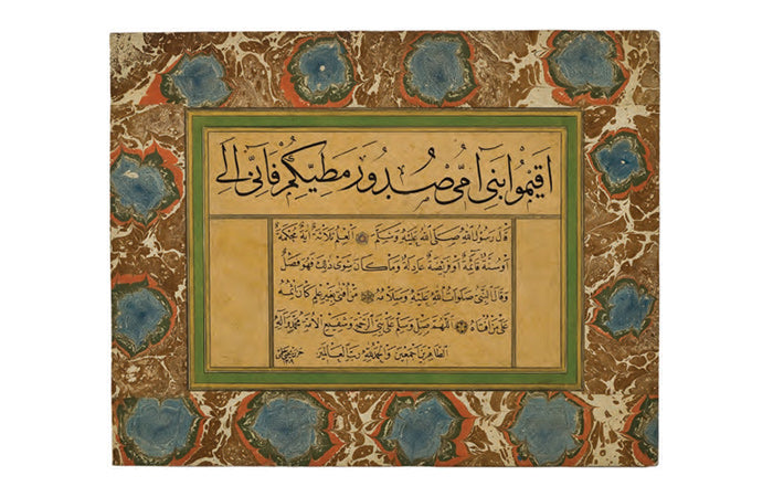 Ketebeli, h.1309 (1891) tarihli. Sülüs hatla câhiliyye dönemi şairlerinden eş-Şenferî’nin şiirinden bir bölüm; nesih hatla “İlmin kaynağı üçtür:….” ve “Kime ilim sahibi olmayan biri tarafından fetva verilirse, günahı fetvayı verene aittir” manasında iki hadîs-i şerif yazılı. Bordürü ebrulu.