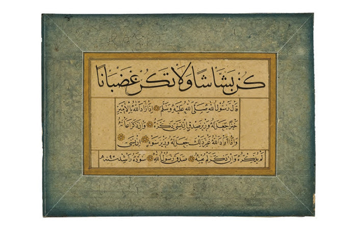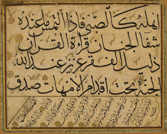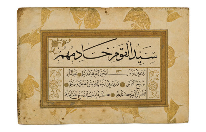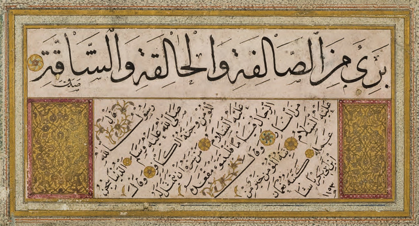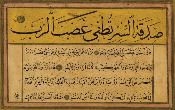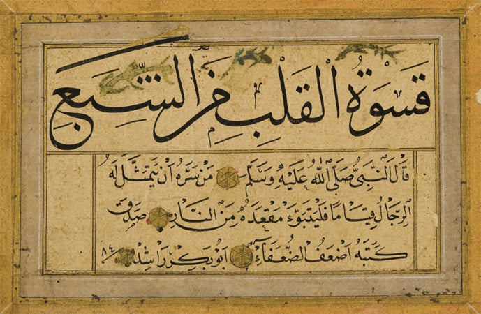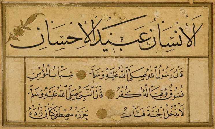 Ketebeli, h. 1153 (1740) tarihli. Sülüs hatla, baş tarafı eksik kalmış bir hadis-i şerif; nesih hatla ise farklı konuları içeren üç ayrı hadîs-i şerif yazılı. Altın çiçek motifleriyle tezhiplenmiş.