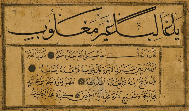 Ketebeli. Sülüs hatla “Daima galip olan, mağlup olmayan Allah’tır” nesih hatla “Kabir ahiretin ilk durağıdır…” manasında devam eden hadîs-i şerif yazılı.
