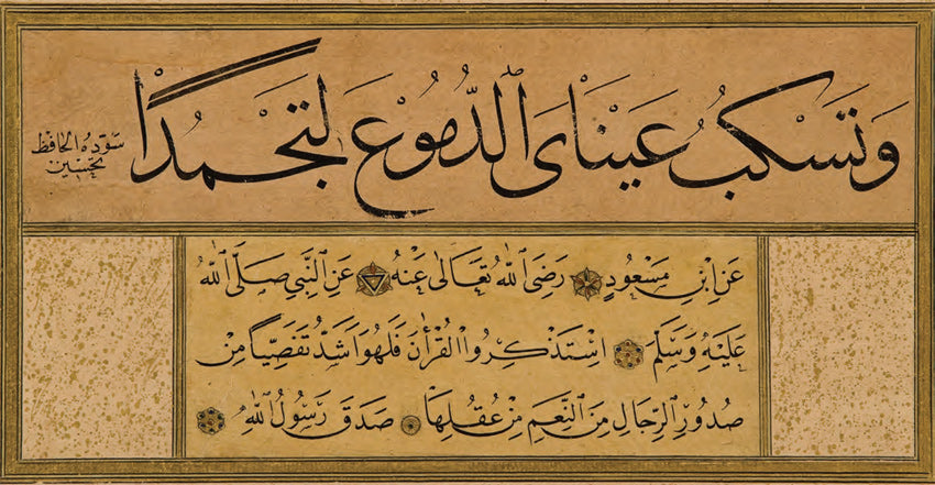 Ketebeli. Sülüs hatla “Çok ağlamaktan artık göz pınarları kurudu” manasında bir şiir; nesih hatla “Kur’an-ı çokça okuyun...” manasında devam eden bir hadîs-i şerif yazılı.