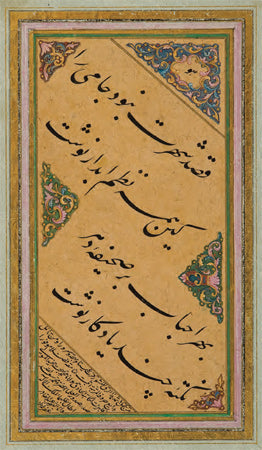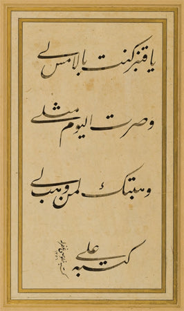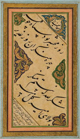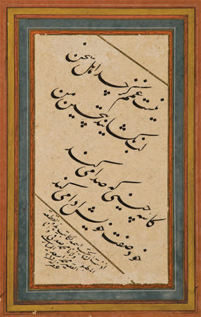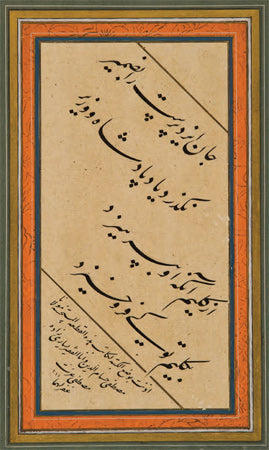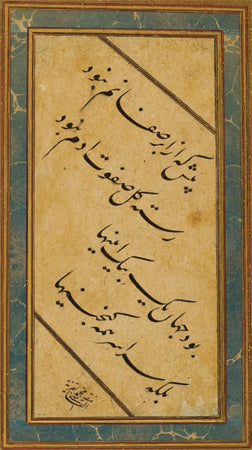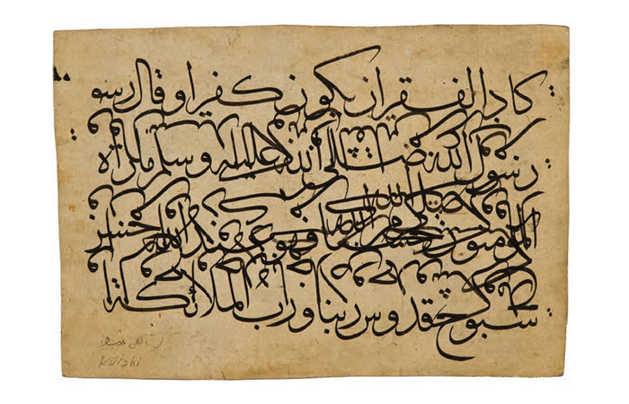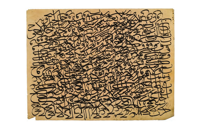 On dokuzuncu yüzyılda başlı başına bir ekol olan Mahmud Celaleddin Efendi’nin, kendisinden kolay kolay ayırt edilemeyecek olan öğrencisi Mehmed Tahir Efendi, Sultan Abdülmecid’in hüsn-i hat hocasıydı. Sol alt köşede rıkâ hattıyla yazdığı ketebede bu karalamayı “Şeyh hattından naklen” yazdığını belirtmiş, hocasının da adını anmaktan geri kalmamış. Dolayısıyla bu nefis eserde üç büyük hattatın emeği var, denilebilir. I.C.S.