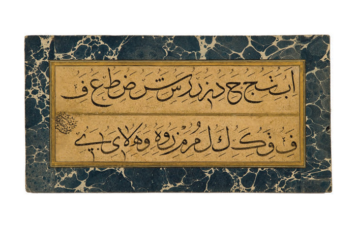 On dokuzuncu yüzyılın tanınmış hattatlarından Seyyid Abdullah Zühdi Efendi, özellikle Medine’ye gönderilmesi ve Mescid-i Nebevi’deki hat eserlerini yenilemesiyle ün salmıştır. İbnülemin onun için “hattın intizam ve insicamında, istifte maharet-i kâmile ibraz eden bir üstad-ı kâmildir” diyor ki bunun yanı sıra Türkçe ibareler yazmaktaki başarısı, fotoğrafçılıkta, resimde ve taş baskısındaki mahareti, bir En’am-ı Şerif’inin Matbaa-ı Osmaniye’de basılması da kayda değer. Elifbanın harflerinin sıralandığı bu kıtanın sadeliği ne kadar iç açıcı, değil mi? I.C.S.