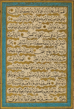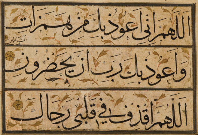 Sülüs hatla “Ey Rabbim! Şeytanların vesveselerinden ve onların benim yanımda bulunmalarından sana sığınırım. Rabbim, sevgini kalbime indir.” manasında dua yazılı. Arka yüzü ebrulu. 17.-18. yüzyıl.