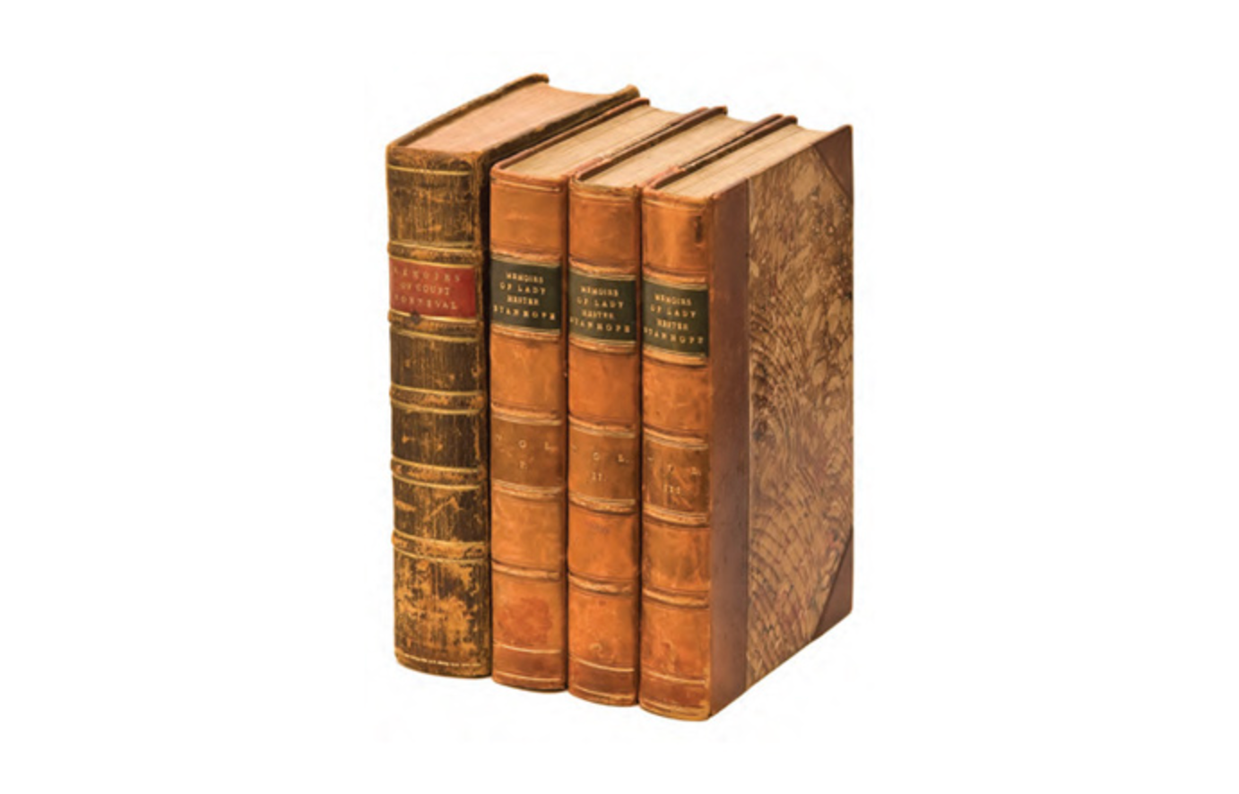 B/ Hester [Lady] Stanhope, Memoirs of the Lady Hester Stanhope, as related by herself in conversations with her physician [Charles Lewis]; comprising her opinions and anecdotes of some of the most remarkable persons of her time. London, Henry Colburn, 1845, 3 cilt: c.1 - xvii, [1], 394 s.; 1 renkli planş; c.2 - vi, 384 s.; 1 planş; c.3 - vii, [1], 361 s.; 1 levha. Döneminin ebru kapaklı cildinde.