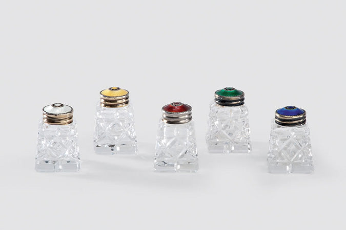 Norveç. Kapakları yeşil, beyaz, sarı, kırmızı ve kobalt mavisi renkte transparan mine tekniğiyle işli. Kristal gövdesi kesme tekniğiyle geometrik desenler işli. 20. yüzyıl. 925 ayar.
