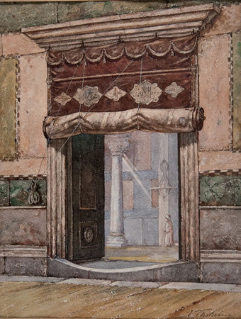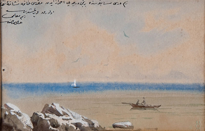 Eski Türkçe imzalı, “Resim dersi müsabakasında 1. dereceyi ihraz eden Mukaddes Hanım’a nişane-i takdir olarak verilmiştir. Resim muallimi Ali Rıza” ithaşı. Kağıt üzerine suluboya.