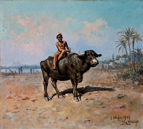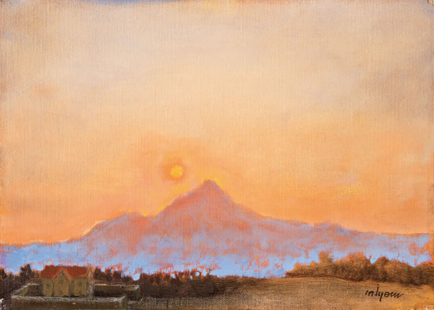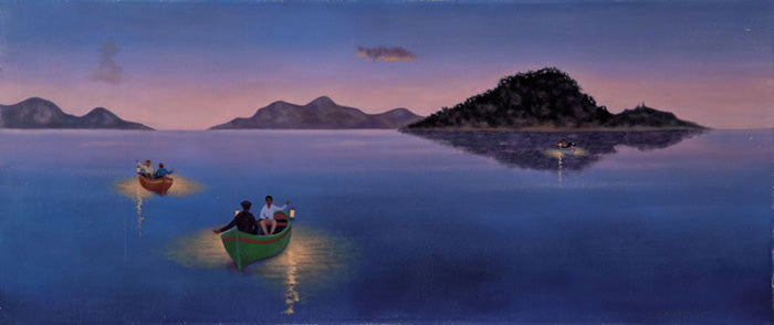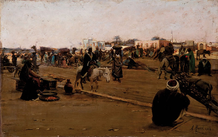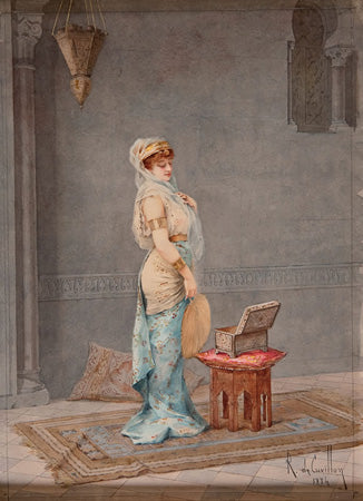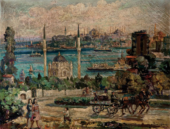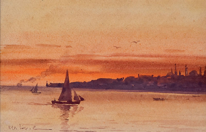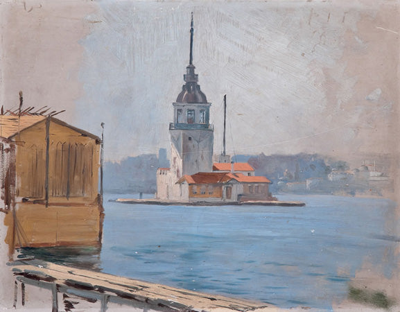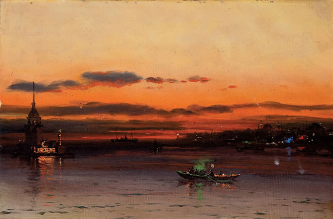 İstanbul’u mavinin ve yeşilin binbir çeşit tonu ile sarmalayan Hoca Ali Rıza’nın günbatımında Kız Kulesini ve boğazın sularını kızıl bir renge dönüştürdüğü nadir kompozisyonlarından biri. Gerilerde bir karartı gibi havada asılı duran bulutlar, kız kulesinin minyatür bir şatoyu andıran silueti ile birleşince ortaya bir hayal kent çıkıyor. Ressam, İstanbul’un doğal ve mimari güzelliklerini başka bir kentle kıyaslanamayacak bir özellik olarak kutsuyor.