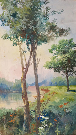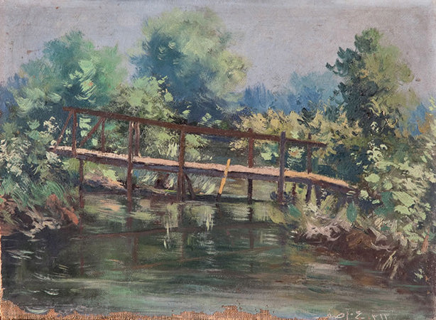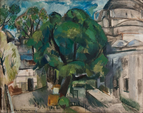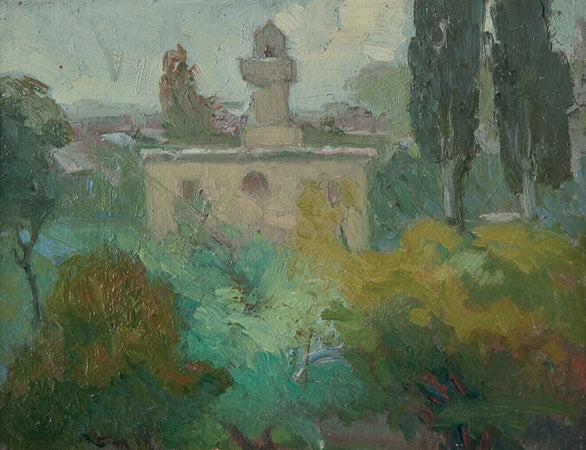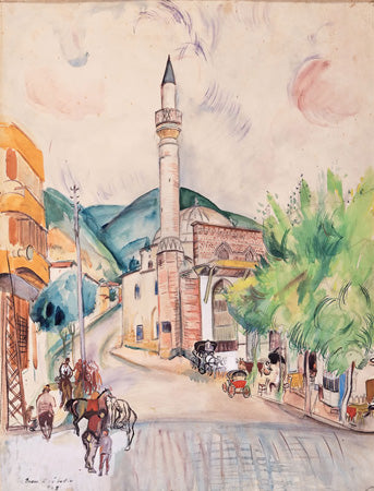 1984’te İstanbul’da yayımlanan ve Adnan Coker tarafından hazırlanan “Avni Lifij Poşadlar” kitabı, s.63’te yer almaktadır. 1914 Kuşağı sanatçıları arasında yer alan Hüseyin Avni Lifij, Türk resim sanatı tarihinde farklı kişiliği ve sanatıyla öne çıkmış isimlerden biri. Osman Hamdi Bey tarafından resimleri Abdülmecid Efendi’ye gösterilen, Abdülmecid’in desteğiyle 1909 yılında Paris’e Fernand Cormon atölyesine gönderilen sanatçının kendine özgü resim anlayışı ve tekniği onu kuşağının tüm ressamlarından ayırıyor. Çalışmaları, ışık-gölge kullanımı açısından Fransız Empresyonistleri’nden izler taşımakla birlikte, resimlerindeki içerik, alegori, şiirsellik onu daha ziyade Sembolistler’e yakın kılıyor. İzlenimden ziyade duyguya ve ifadeye önem veren Hüseyin Avni Lifij, poşadlarında tıpkı bu resimde olduğu anlık duyumsamalarını kayda geçiriyor. küçük bir mimari ünite olarak yeşillikler içerisindeki bir cami, birbirinin içerisinde kaybolan renk katmanları arasında gerçekten de anlık bir izlenimin ardından belirdiğini hissettiriyor. Neredeyse avuç içi büyüklüğündeki bir yüzeyde bu derinlikte bir imgeyi gizleme becerisi, insana resim sanatının yanılsama gücünü bir kez daha hatırlatıyor.