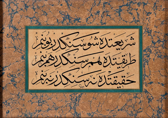Eski Türkçe imzalı, h.1303 (1885) tarihli. İmza kazıma tekniğiyle atılmış. Tuval üzerine yağlıboya. Duralite maruşe edilmiş.