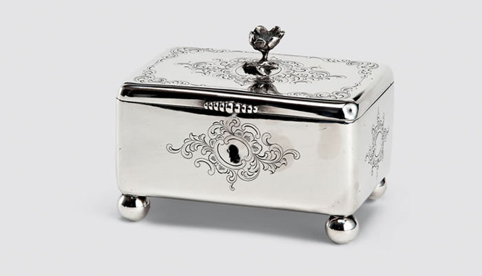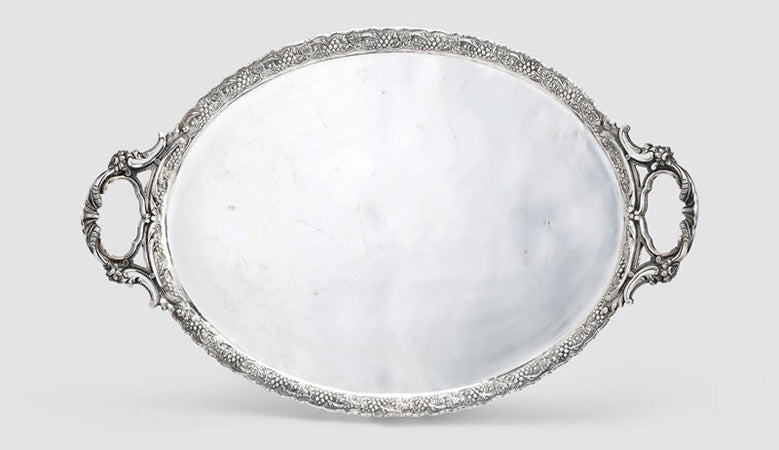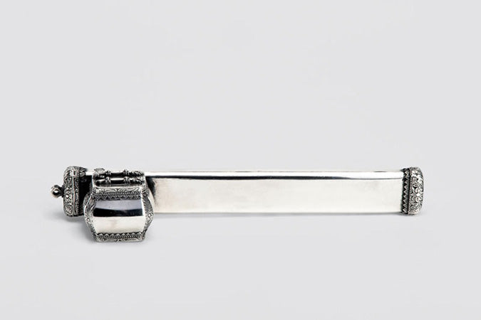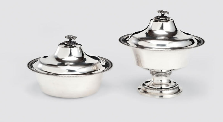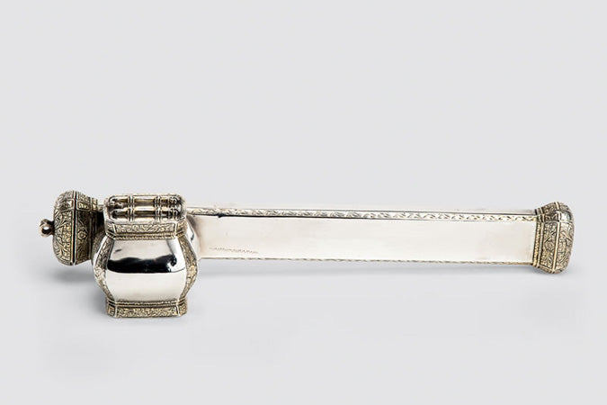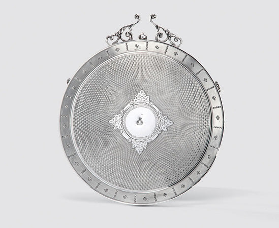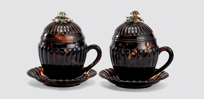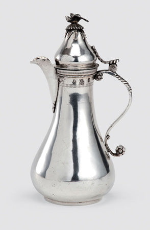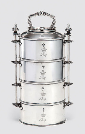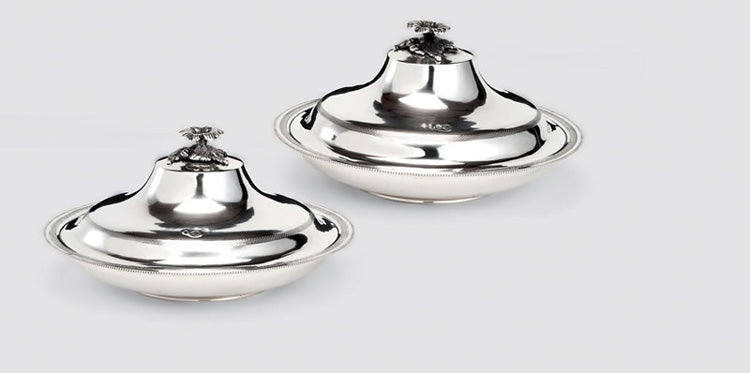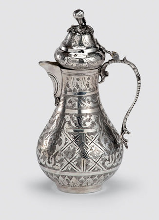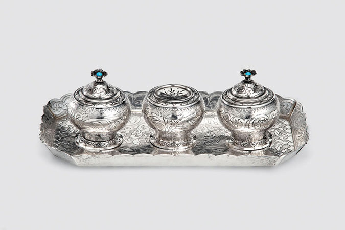 Sahleplik düz dipli, şişkin gövdeli, kulplu, bombe kapaklı ve dilimli. Çiçek formundaki kapak tutamağı mine ve incilerle bezeli. Tabak düz dipli yayvan gövdeli, alçak kenarlı ve dilimli. 19. yüzyıl.