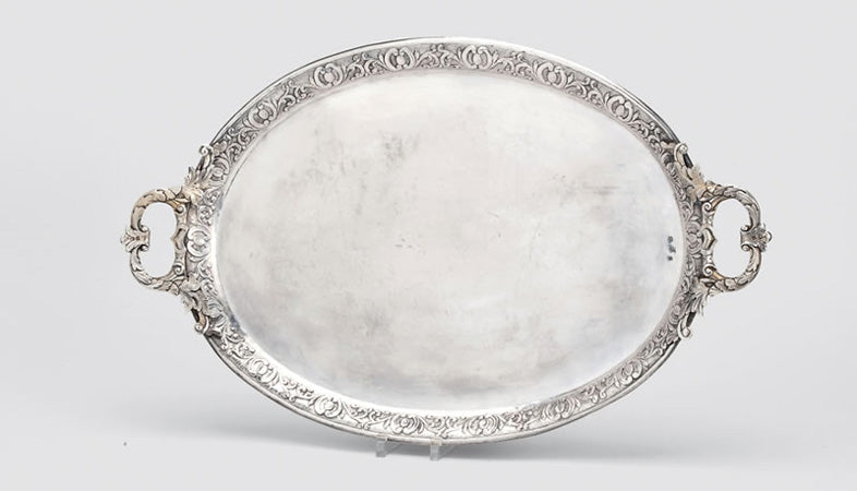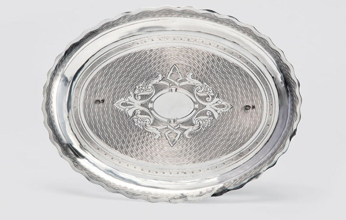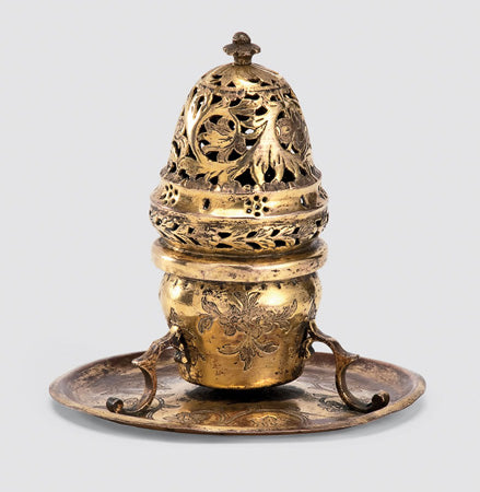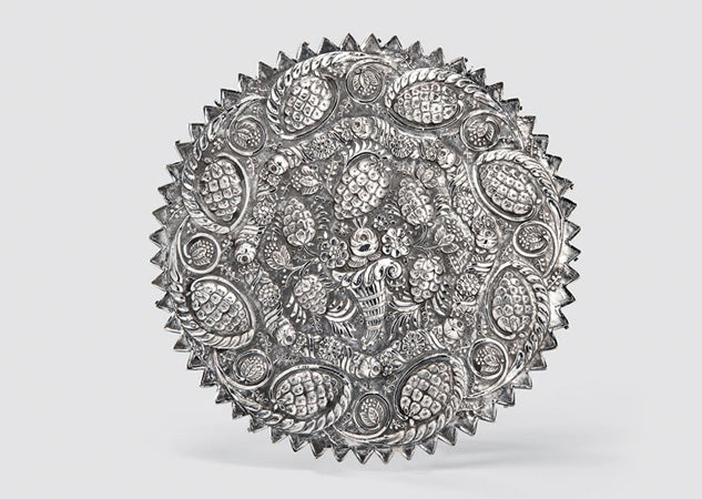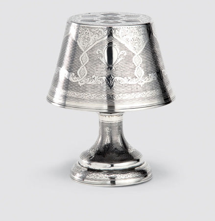 Yuvarlak bir tabla üzerinde yer alan şişkin gövdenin kapağı kubbe formunda. Tablası ve gövdesi kazıma tekniğiyle stilize yaprak ve çiçek motişeri işli. Ajurlu kapağı iri çiçek motişeriyle bezeli. Gövde ve kapağın tombağı iyi durumda, tablanınki yer yer silinmiş. 19. yüzyıl