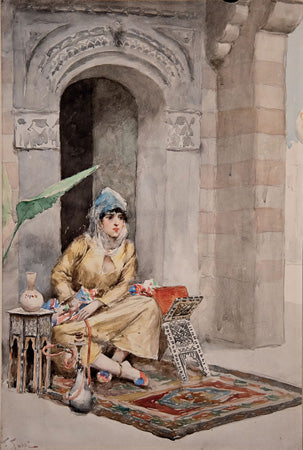 Kağıt üzerine suluboya. Arkasındaki mektupta eski Türkçe“Nezahat berber kızım bundan mukaddemnezih ve mukadder kalbinin muallimlerine karşıbildiğin ihtiramları işar edici iltifatnamene mukabeleedemeden bu ikinci tebrik kartınızı aldım kalbimizinneali fiefik olduğun ve buna mukabil yüreğindehasıl eylediği ihtisasatı tarifden kalbim ıshar acz etmektedir. Kızım mukaddesim bu vicdanın bu terbiyen seni pek muhterem bir hanım ve pek şevkatkar bir valide kılacaktır. Ve ismin gibi kutsiyetle be mekan eyleyecektir. Kızım bununla meshut bahtiyar ol. Yavrum pek çok selam ve dualar eder ve kandili şerifinizi tabrik eylerim. Cenabi hak bi sıhat ve afiye emsali kesiresini idrakle dilşad buyursun ve feyzi afiyetini müzddad ve her işinde teyfikatını suphaniyesini refik eylesin. Gayyur çalışkan hatırşinaz kızım fi teşr-i sani h.1338 resim muallimi. Ali Rıza” yazılı.