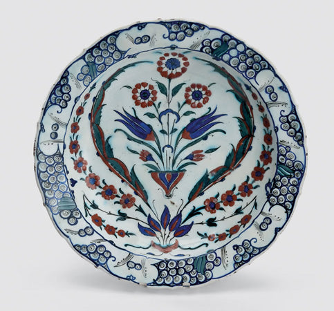 Düz dipli yayvan gövde alçak ve dışa dönük kenarlı. Beyaz zemin üzerine kobalt mavisi, yeşil ve kırmızı, saz yaprağı ve çiçek motişeriyle bezeli. Bordürü stilize çin bulutu motişeriyle çevrili. Arka yüzeyinde kobalt mavisi çiçek motişeri yer almakta. 16. yüzyıl son çeyreği.