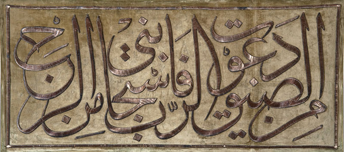b. Yeşil kadife zemin üzerine gümüş tel kullanılarak celî sülüs hatla “Sıkıntıdan dolayı Rabbime dua ettim o da bana genişlik verdi” yazılı.