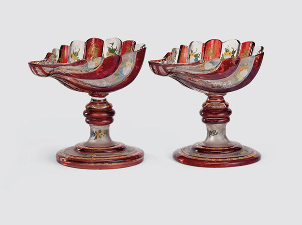 Osmanlılar için özel yapım. Yuvarlak bir kaide üzerinde yer alan yüksek ve dilimli gövde istridye formunda. Bordo ve renksiz zemin üzerine altın yaldız ve muhtelif renkte çiçek ve yaprak motişeriyle bezeli. 19. yüzyıl.