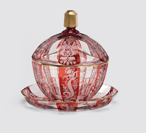 Osmanlılar için özel yapım. Kase düz dipli, şişkin gövdeli, geniş ağızlı ve bombe kapaklı. Tabak düz dipli ve yayvan gövdeli. Mevlevi külahı tarzında kapak tutamağı altın yaldızlı. Dilimli. Koyu kırmızı ve renksiz zemin üzerine kesme tekniğiyle muhtelif çiçek motişeri işli. Tabak bordüründe kü...