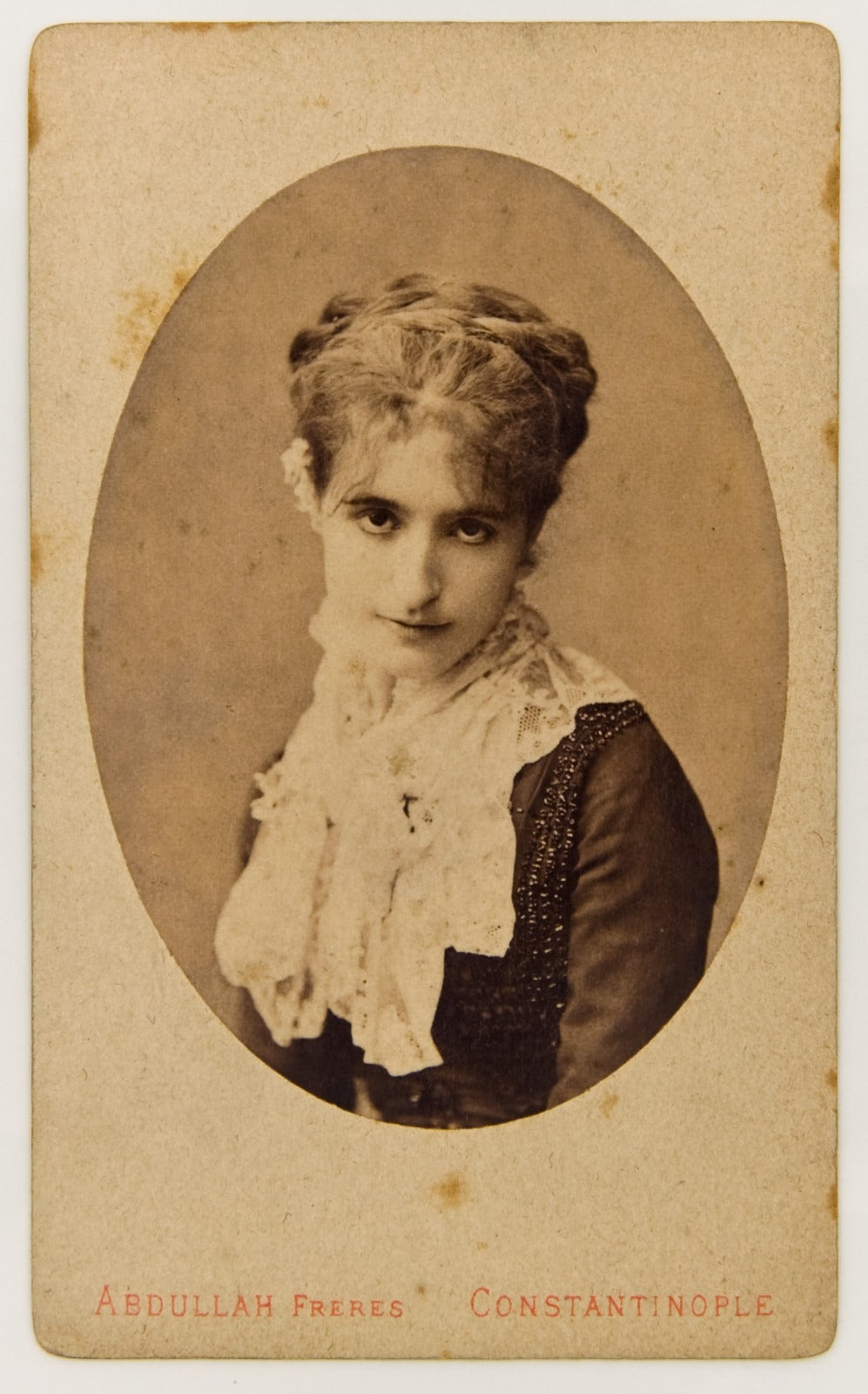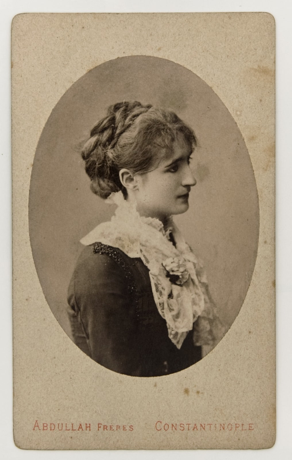 Buna ilaveten, 1906 tarihli Mimozalı Kadın Marie’yi artık olgun bir döneminde – yaklaşık 45 yaşında – gösterirken bu tablonun gençlik yıllarına ait olduğu aşikârdır. Tuvalde herhangi bir tarih yer almaması kesin bir şey söylememize imkân vermiyorsa da bazı tahminler yürütmek mümkündür. Bunun için Marie/Naile’nin meşhur Abdullah Biraderler fotoğraf stüdyosunda çekilmiş olan iki fotoğrafına başvurabiliriz. (Resim 3 ve 4) Genç kadının görüntüsü, saçı ve kıyafetine olduğu kadar her iki fotoğrafın da aynı şekilde oval bir çerçeveye alınmış olmasına bakılırsa bu iki resmin aynı gün çekilmiş olduğu kesinlik kazanmaktadır. Fakat bizim açımızdan daha da önemli olan, Marie’nin bu fotoğraflardaki hatlarının büyük portredeki görüntüsüne çok benziyor olmasıdır. Bu ipuçlarına bir tane daha ekleyelim: Fotoğrafların birinin arkasında kurşun kalemle “1882 – Edhem” yazısı yer almaktadır. Bu ibareden çıkarılabilecek en bariz mana, çiftin tam da o yıl doğan oğulları Edhem’le (1882-1957) ilgili olabileceğidir. Fakat her türlü yoruma açık olan bu bağlantıyı bir kenara bırakırsak, söz konu fotoğrafların 1882’de çekilmiş olduğu, dolayısıyla da yağlıboya portrenin de o sene olmasa bile çok yakın bir tarihte yapıldığı kuvvetle muhtemeldir.